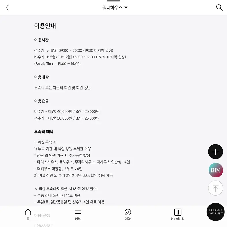 요금의 경우 객실 정원 내 인원은 무료이며 횟수 제한 없이 무제한 이용이 가능하다. 참고로 스위트와 더하우스 확장형만 정원이 6인이고 나머지 룸은 4인이다. 정원 외 추가 인원은 2인까지 30% 할인이 적용된다.