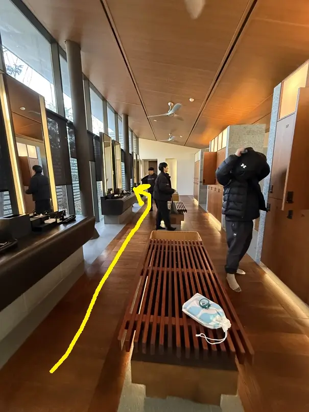 탈의실 내부는 은근히 넓고 사람이 붐비지 않아 좋다. 하지만 치명적인 단점이 하나 있는데, 수영장에서 샤워실로 가는 동선 바닥에 물기가 많다는 점이다. 아래 사진을 보면 노란색 화살표가 수영장 입구에서 샤워실 입구로 가는 동선이다. 자칫하면 옷을 갈아입거나 양말을 신을 때 물기에 젖을 수 있다.