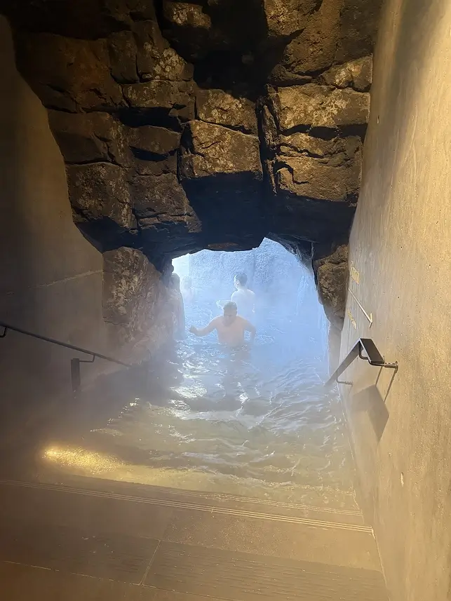 동굴을 빠져나가면 온천이 바로 시작된다. 지열수를 이용한 온천이다. 현재 아이슬란드에서 가장 핫한 온천이기도 하다. 입장료도 상당히 센 편.