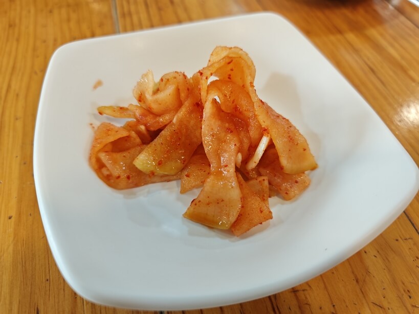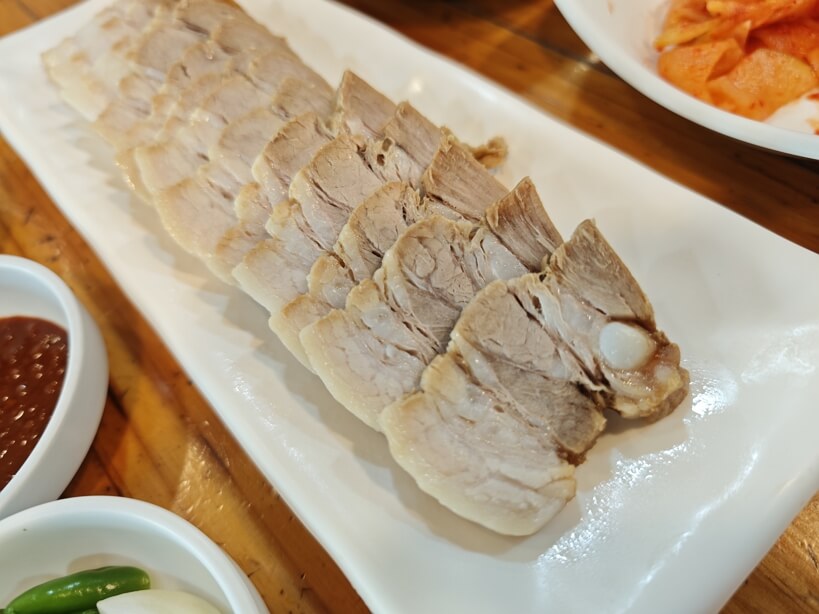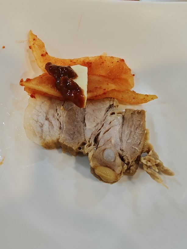삼겹살 편육은 맛이 없을 수가 없다. 적당히 부드럽고 쫄깃하다. 비싼 부위인 만큼 양은 많지 않다. 오돌뼈가 아이가 먹어도 괜찮을 정도로 부드럽다.