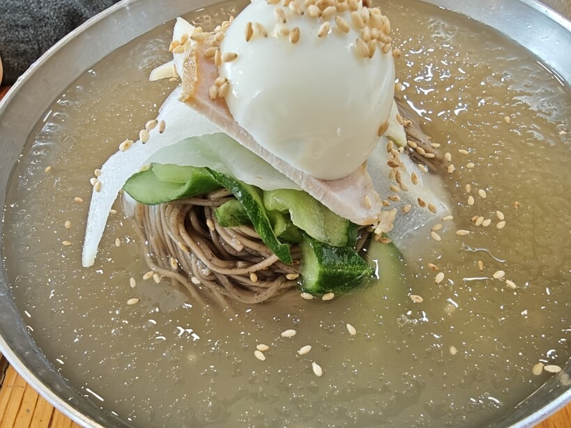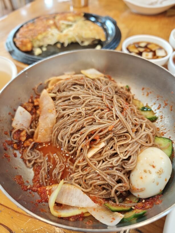 물 막국수는 살짝 심심한 맛이다. 초등학생 아이가 먹었는데 나중에 비빔 한 젓가락 먹고 비빔으로 먹을걸 후회했다는…
