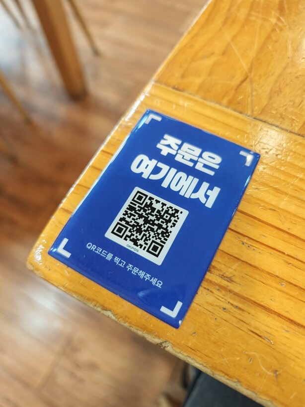 테이블 모서리에 QR코드가 붙어 있어 스마트폰으로 바로 주문이 가능하다. 결제까지는 아니고 주문만 가능하며 계산은 다 먹고 나갈 때 출입구 쪽에서 하면 된다. 수저통 옆에 종이로 된 주문서도 있는 것을 보니 종이로 주문도 가능해보인다.