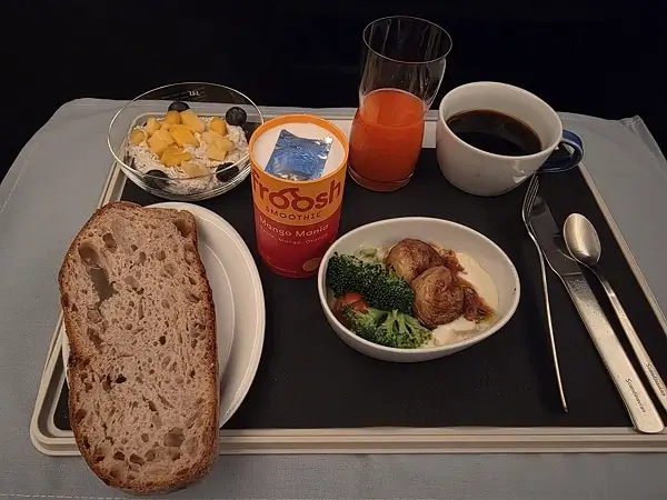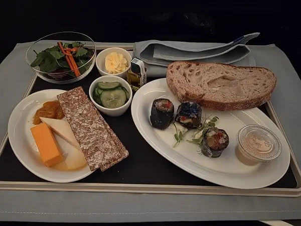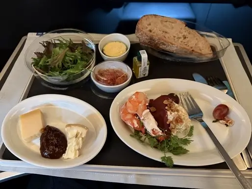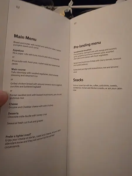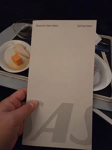 인천에서 코펜하겐으로 밤 11시 30분에 출발을 하는데 이륙 후 약 한 시간 뒤 기내식이 제공된다. 기내에 착석하면 웰컴 드링크를 준다. 이륙 전 승무원이 식사 여부를 미리 묻는다. 비즈니스석이라 코스로 나오는데 한국 시간으로 밤 12시가 넘어 코스 요리라는 게 좀 괴롭다. 식사를 거의 한 시간에 걸쳐서 하는듯했다.ㅋ