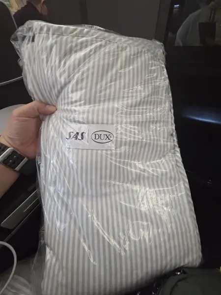 기내침구 역시 덕시아나 제품이다. 아무래도 스칸디나비아 항공이 덴마크, 노르웨이, 스웨덴 3국 연합 항공사이기 때문에 스웨덴 명품인 덕시아나 이름을 넣어 쓰는 것 같다. 침대 하나에 3천만원은 기본으로 하는…ㅋ (더 싸고 더 비싼 것도 있지만 난 못 삼) 침구는 이륙 전, 착륙 전 발 끝 부분의 빈 공간에 넣어두라고 한다.