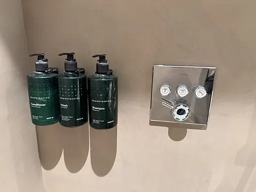 샤워실 내부는 아래와 같다. 샴푸, 바디워시, 컨디셔너가 있고 드라이기가 있다. 수건은 2장이 있다. 참고로 스킨, 로션은 없다. 저 드라이기 바람이 어찌나 뜨겁던지 머리와 피부가 건조하다 못해 갈라지는 듯했다. 라운지 내부에도 로션이 따로 없어 밖에 나가 면세점에서 크림을 따로 구입했다는… ㅜ
