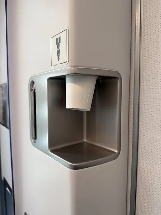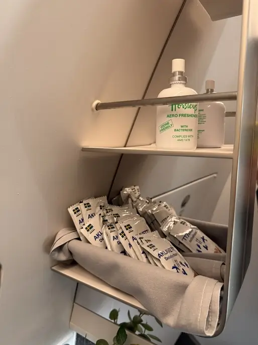 내부는 이코노미 화장실보다 살짝 넓다. 소독 티슈, 종이컵, 뿌리는 방향제 등이 있다.